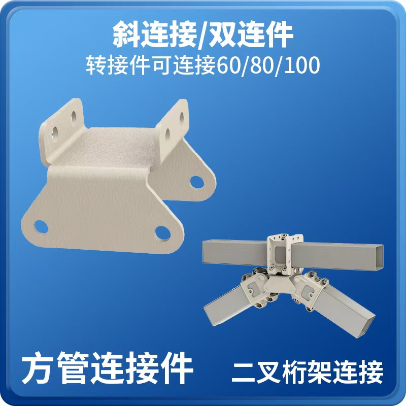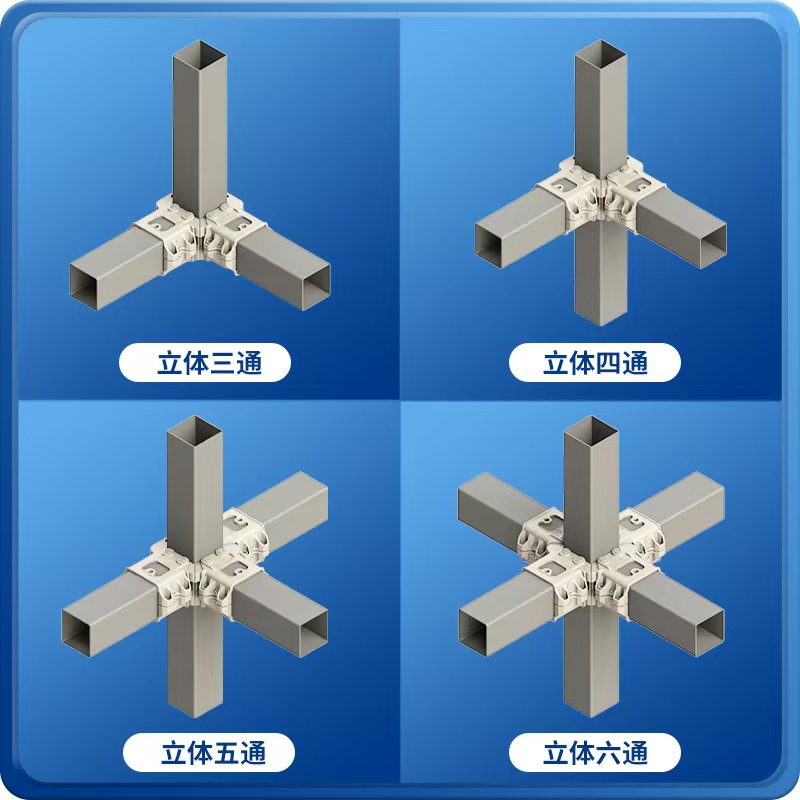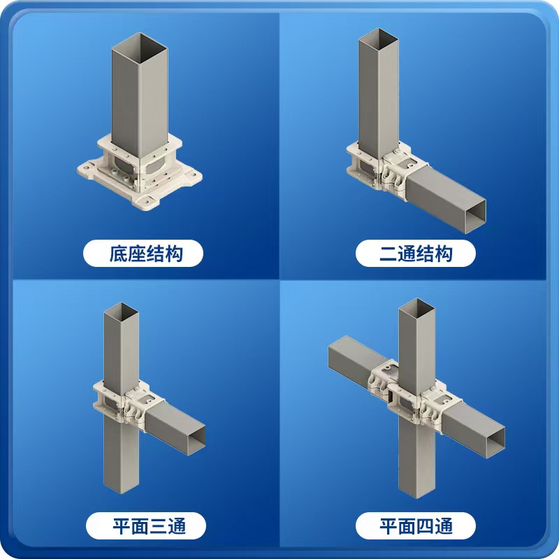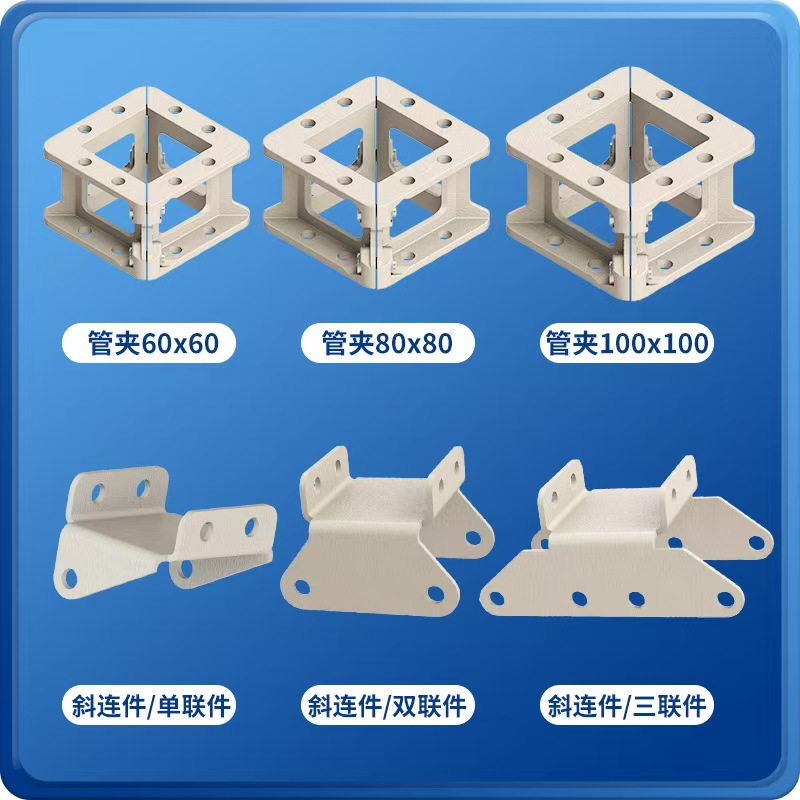 产品简介:装配式方管连接件,是方管组装构架的连接零件。实现相同和不同规格的组合连接,使用该连接件只需低噪环保操作,便能组装不同用途的构造架。无需焊接、无需打孔,按需下料。方管连接只需用螺丝安装管夹,另一段管头安装手掌,通过销轴将管夹与手掌实现连接。一个管夹四个方向都可连接手掌,通过两个不同的零件组成不同功能的方管连接件。